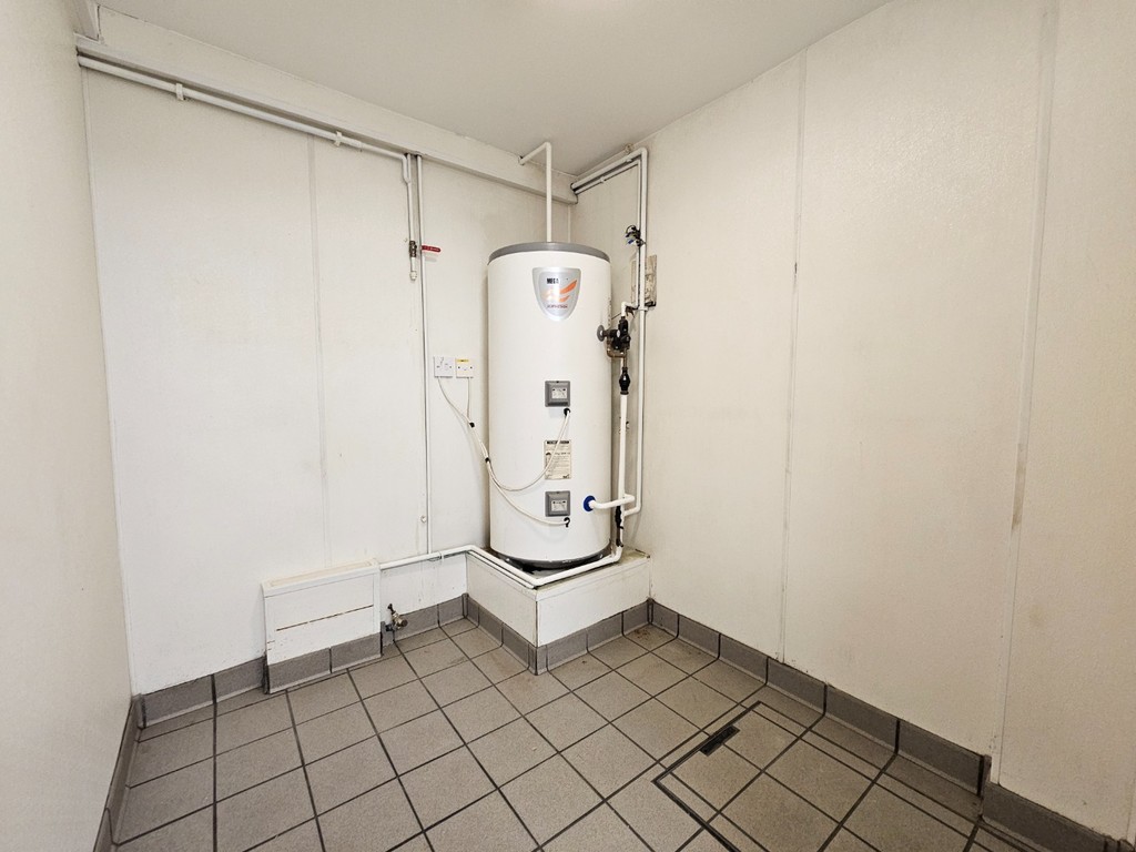STORE ROOM (1.73m x 2.06m) The store room at the back of the shop features tiled flooring and lighting, houses the hot water cylinder, and has a door leading to a smaller storage area.