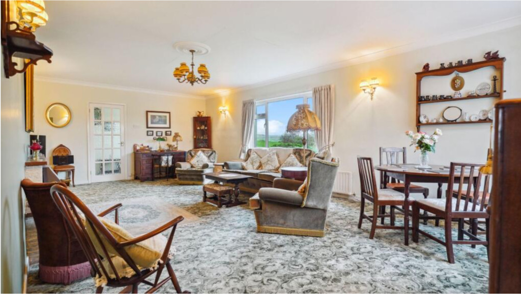 LOUNGE – (7.60m x 4.28m) The spacious living room is filled with natural light through large picture windows that frame the stunning countryside views. A feature fireplace forms a cosy focal point, making this an ideal space for both relaxing and entertaining.