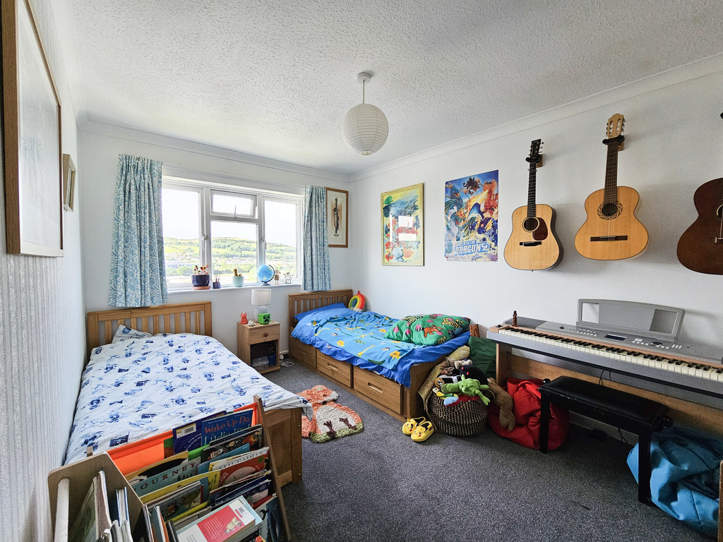BEDROOM TWO Featuring an electric panel heater and an elevated front window that offers lovely views across the town and towards the distant sea.