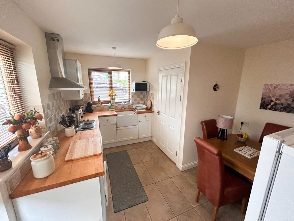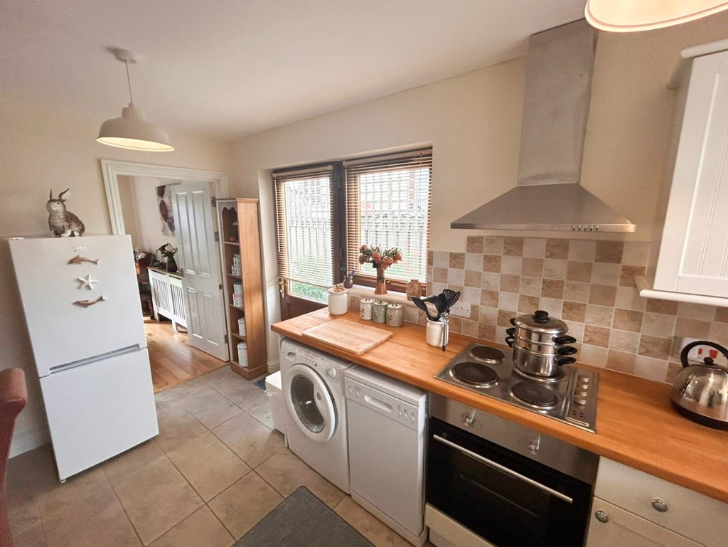 A bright and well-equipped kitchen offering a range of fitted base, drawer, and wall units, complemented by a Belfast sink and ample worktop space. Features include a four-ring electric hob with built-in oven, plumbing for a washing machine, tiled flooring, under-stairs storage cupboard, multiple twin power points, double panel radiator, and a door leading directly to the rear garden – perfect for indoor-outdoor living.
