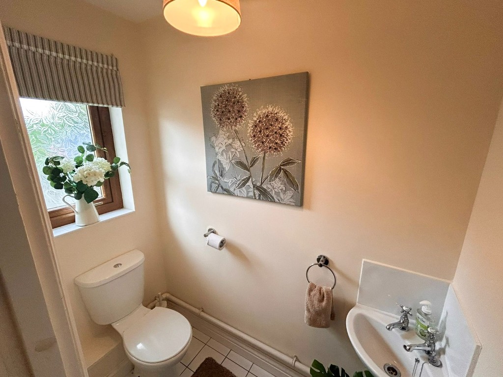 CLOAKROOM Convenient ground-floor WC fitted with a low-flush toilet, pedestal wash hand basin, and housing the electric consumer unit.