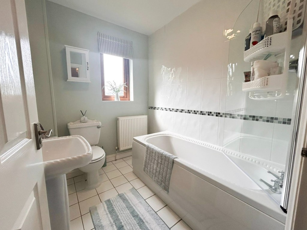 BATHROOM Fitted with a panel bath and shower over, pedestal wash hand basin, low-flush WC, extractor fan, and double panel radiator.