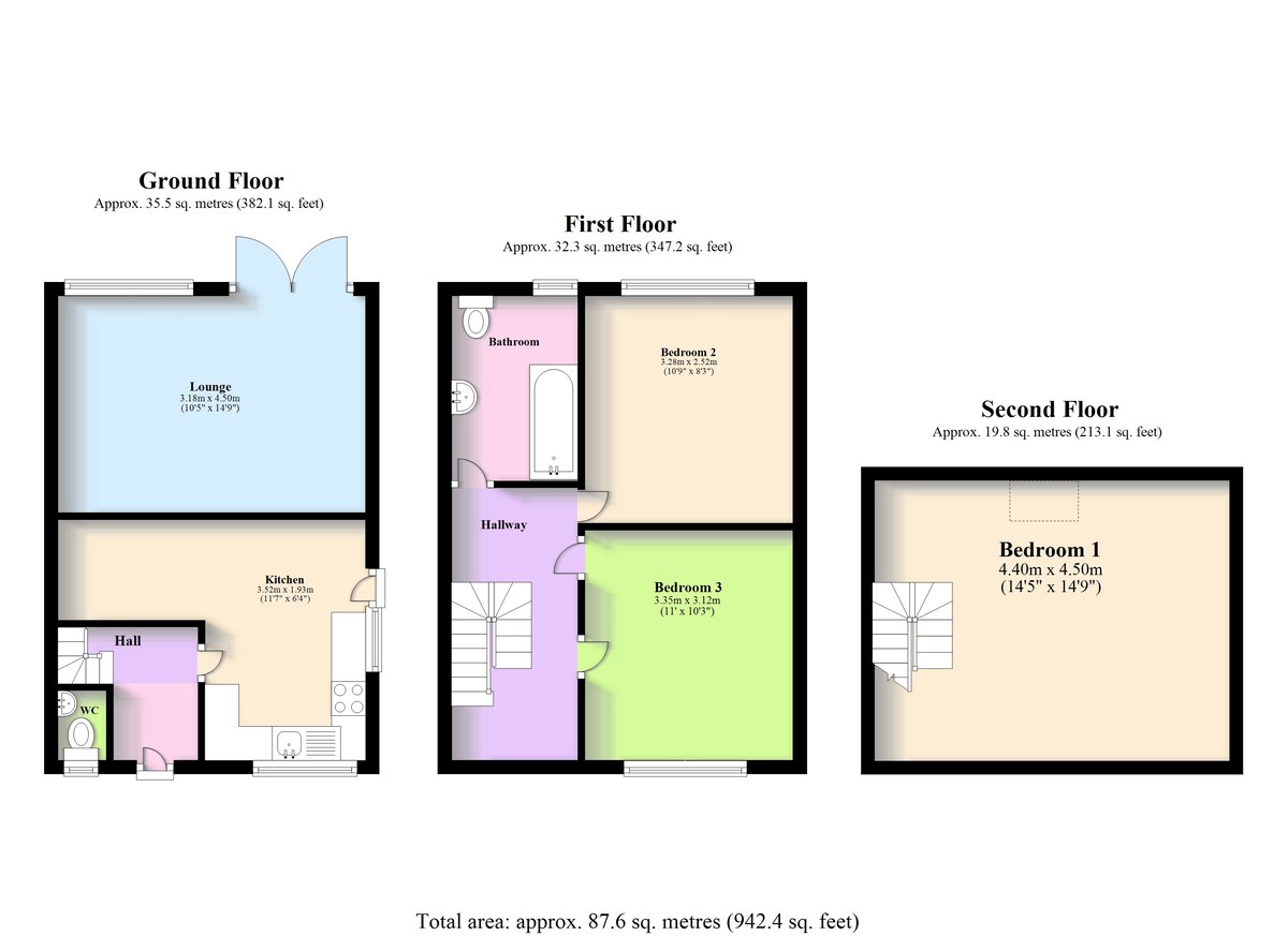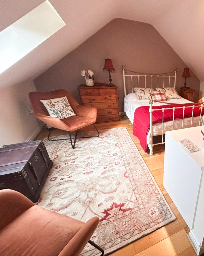MAIN BEDROOM (4.50m x 4.40m) Occupying the entire attic space, this impressive main bedroom includes a rear-facing Velux window, double panel radiator, twin power points, BT extension, TV point, and access to useful eaves storage.