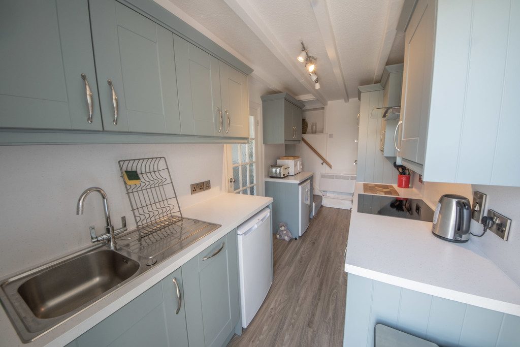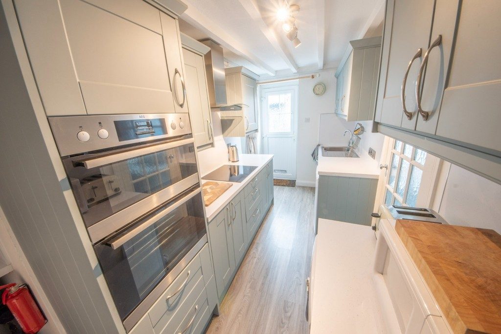 KITCHEN Complete with integral induction hob, double oven, and extraction hood. Stainless steel sink, space for a washing machine.