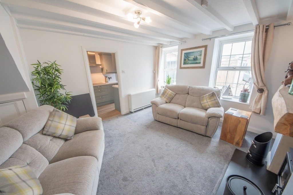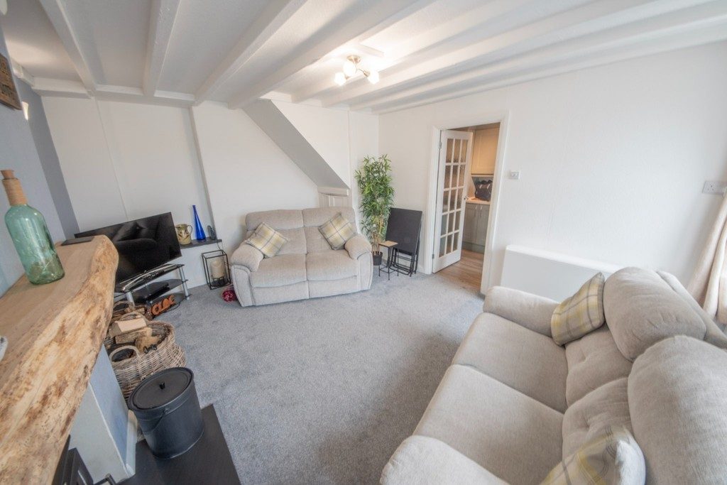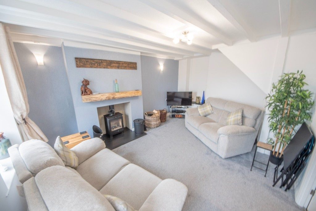 LIVING ROOM Cosy living space with a newly fitted log burner, oak beam mantle above, wooden beams to ceiling.