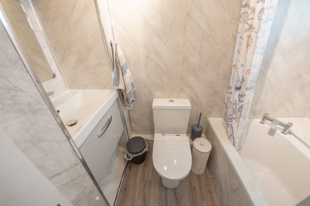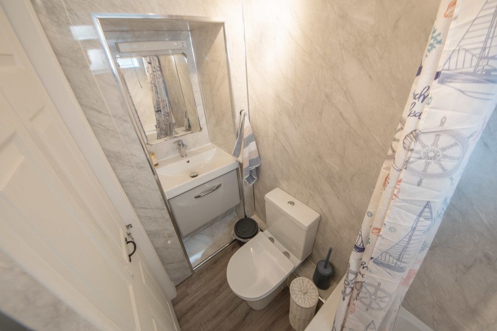 BATHROOM White suite comprising wash hand basin set into alcove with vanity unit below, toilet, and bath with electric shower over. All walls are clad in a marble effect bathroom wall panels.