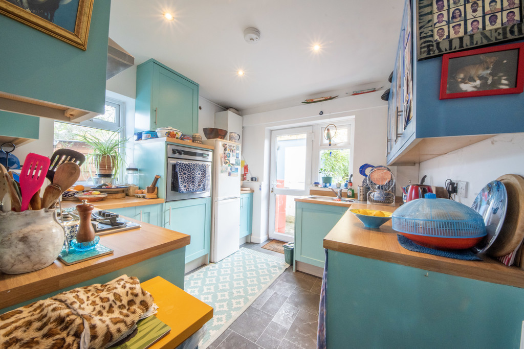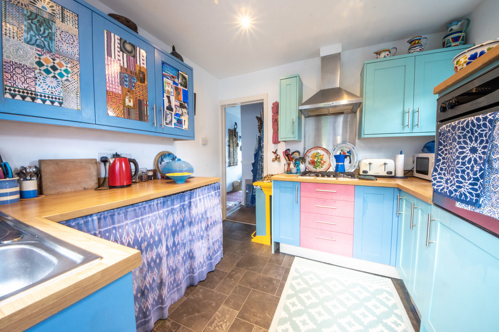 KITCHEN 9′ 3" x 9′ 3" (2.84m x 2.84m) Situated at the rear of the property the kitchen is made up of a range of base and eye level units with wood effect worktops. The stainless steel sink is situated overlooking the garden. Also included is a 4-ring hob, overhead extractor hood and oven fitted at eye level. Communicating door out to the rear garden.