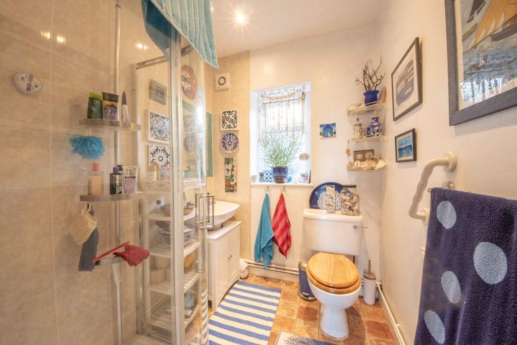 SHOWER ROOM 6′ 11" x 5′ 6" (2.11m x 1.70m) Complete with white suite including toilet, basin and double shower. Natural stone effect tiles to water sensitive areas.