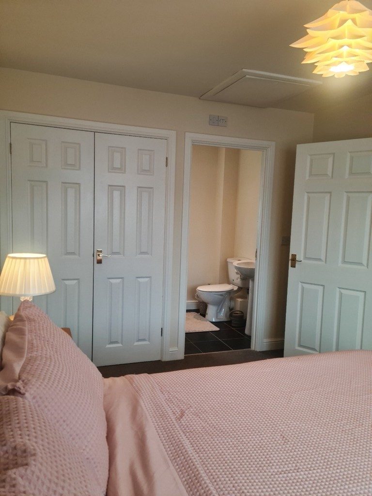 EN SUITE SHOWER ROOM 5′ 3" x 9′ 1" (1.61m x 2.79m) The en-suite bathroom has a double glazed UPVC window overlooking the rear of the home. The suite comprises a low flush W.C, walk in electric shower with glazed screen doors and a white basin. Ceramic tiled walls and floor.
