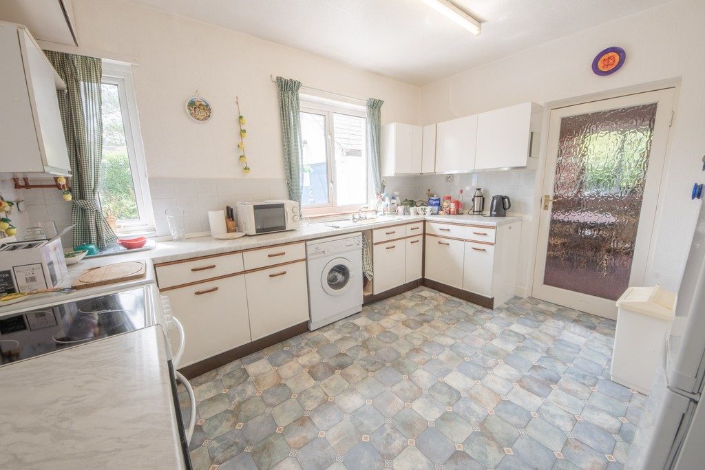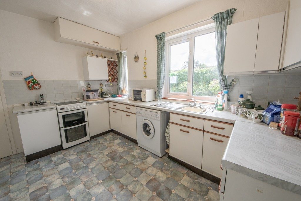 Large living space with walls of a neutral colour. Electric Parkray Fire installed. Brick feature around the electric fireplace. Large bay window over looking the side garden & apple tree.KITCHEN – 3.10m x 3.80m (10’2 x 12’6)