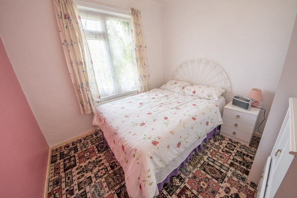 Double bedroom rear to the property, with pink walls and patterned carpet.BEDROOM THREE – 2.75m x 3.65m (9′ x 12′)