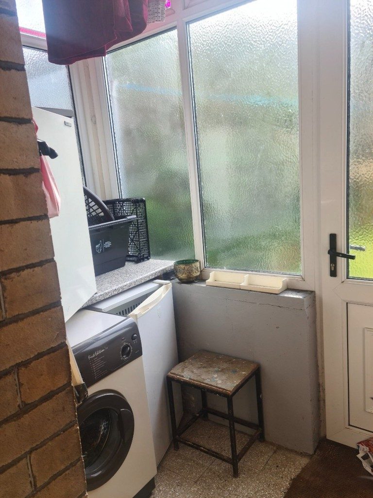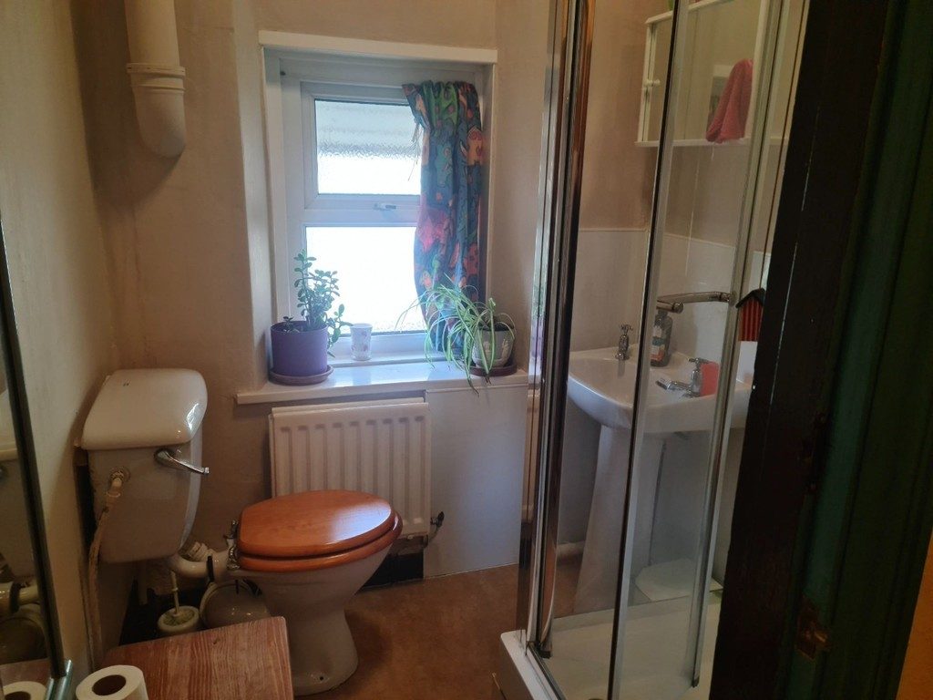 This is a compact bathroom space, designed for efficiency and practicality, The bathroom features a white toilet and basin, offering a clean and classic appearance. These fixtures provide essential functionality in a small space. A walk-in shower is included in the bathroom, featuring a stainless steel mains showe served by the combi boiler. This shower is designed for convenience and efficiency, making it an ideal choice for a compact bathroom. A frosted double-glazed window is situated on the side of the room. This window design ensures privacy while allowing natural light to enter the space. The bathroom is illuminated by a square ceiling light.BACK BEDROOM (3.9m x 3.2m) BACK BEDROOM (3.9m x 3.2m)