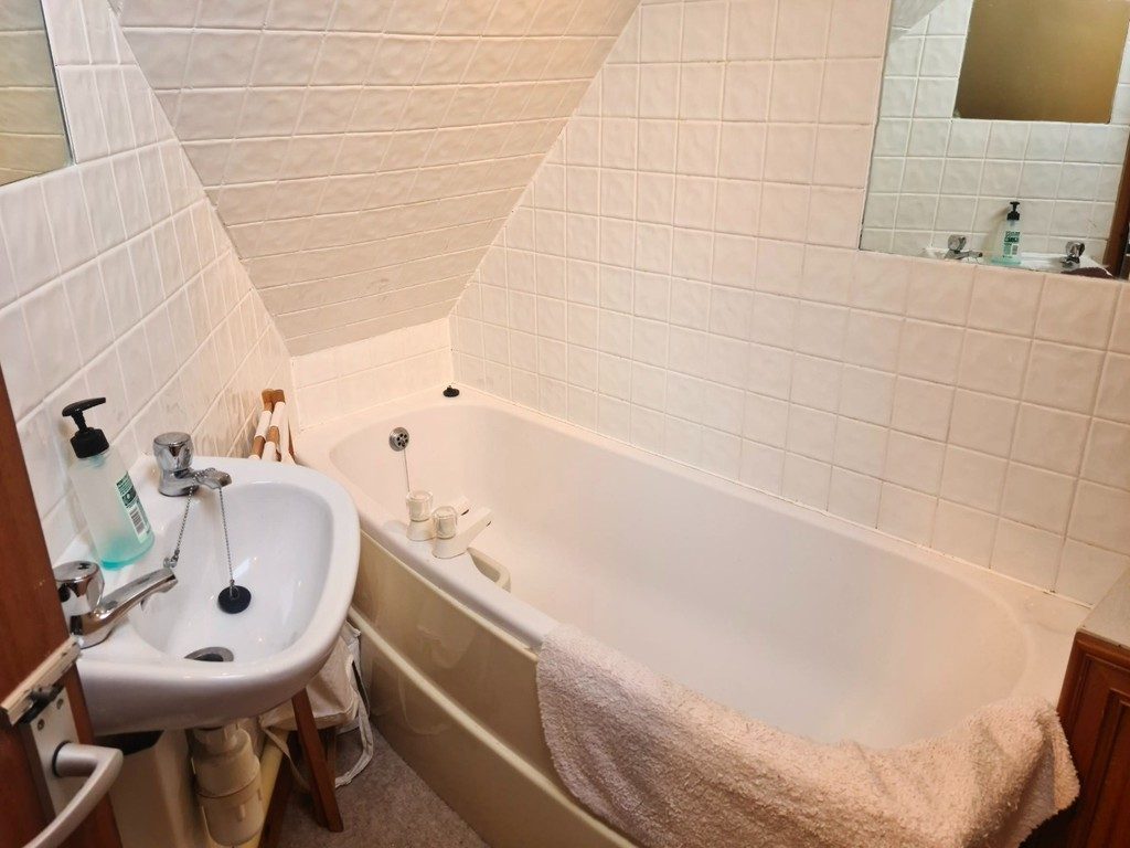 This bathroom is small but packed with character, making efficient use of the available space to create a charming and functional retreat. The bathroom boasts a vaulted ceiling, which adds depth and architectural interest to the space, making it feel more open and inviting. The bathroom features classic white fixtures, including a white toilet, basin and white bath. A small Velux style window, set at an angle in the vaulted ceiling, brings in natural light, creating a bright and inviting ambiance. This window also provides ventilation and a connection to the outdoors. Spotlight lighting is strategically placed to illuminate the bathroom effectively.TOP FLOOR BEDROOM ( 3.77m x 2.12m)This TOP FLOOR BEDROOM ( 3.77m x 2.12m)