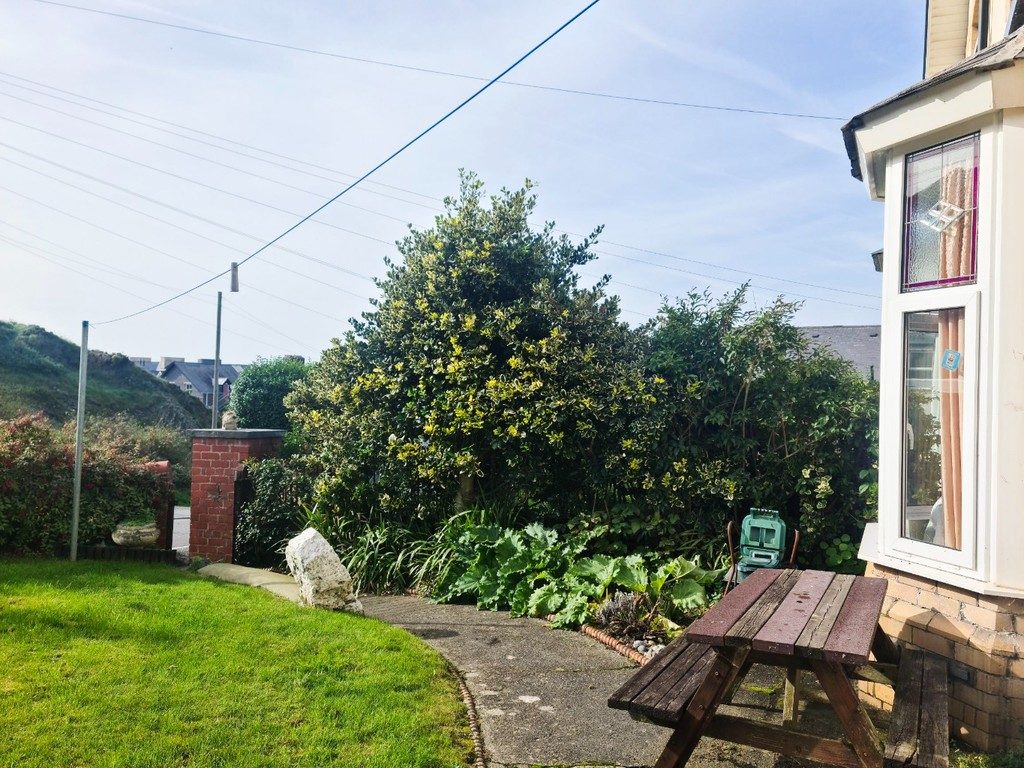 The back of this Victorian property features a spacious driveway that can comfortably accommodate two cars, providing convenient off-street parking, cultivated flower bed area. The property offers sea views from the back, allowing you to enjoy the tranquil and ever-changing beauty of the coastline right from your own space. From this vantage point, you can also revel in panoramic views of Constitution Hill, a local landmark and a place of natural beauty. A convenient footpath on the side of the property gives access to a useful understairs external storage space with mains power and an outside tap, the path guides you to the front, creating a seamless connection between the front and back areas of the home.FRONT GARDEN FRONT GARDEN